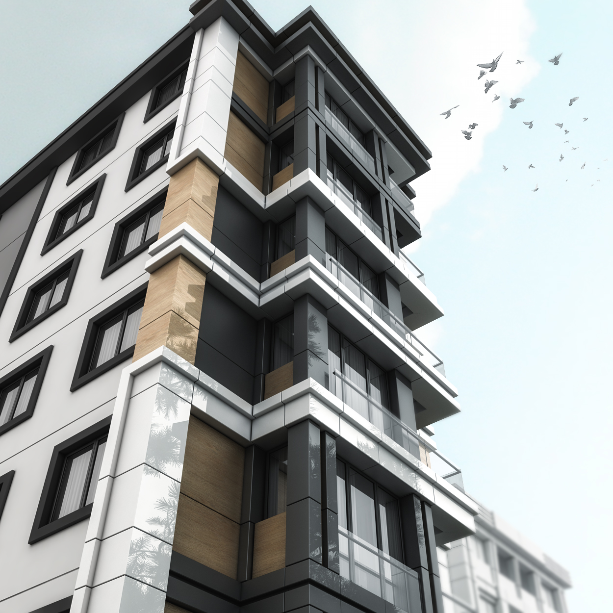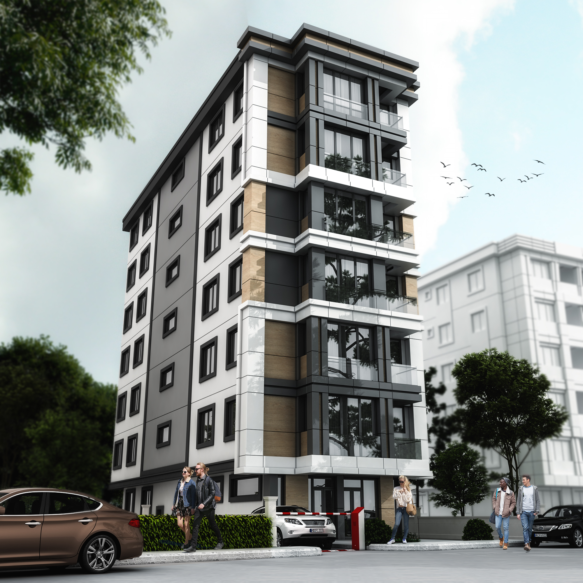 Cephe tasarımında, bölgenin zarif ve sakin mimari kimliğiyle uyumlu malzeme tercihleri ve yalın geometriler kullanılarak yapı, zamansız bir dış görünüşe kavuşturulmuştur. Doğal ışığın iç mekânlara etkili biçimde alınması, ferah hacimlerin oluşturulması ve ergonomik planlama ilkeleri doğrultusunda tasarlanan yaşam alanları, kullanıcı konforunu artıran detaylarla zenginleştirilmiştir.