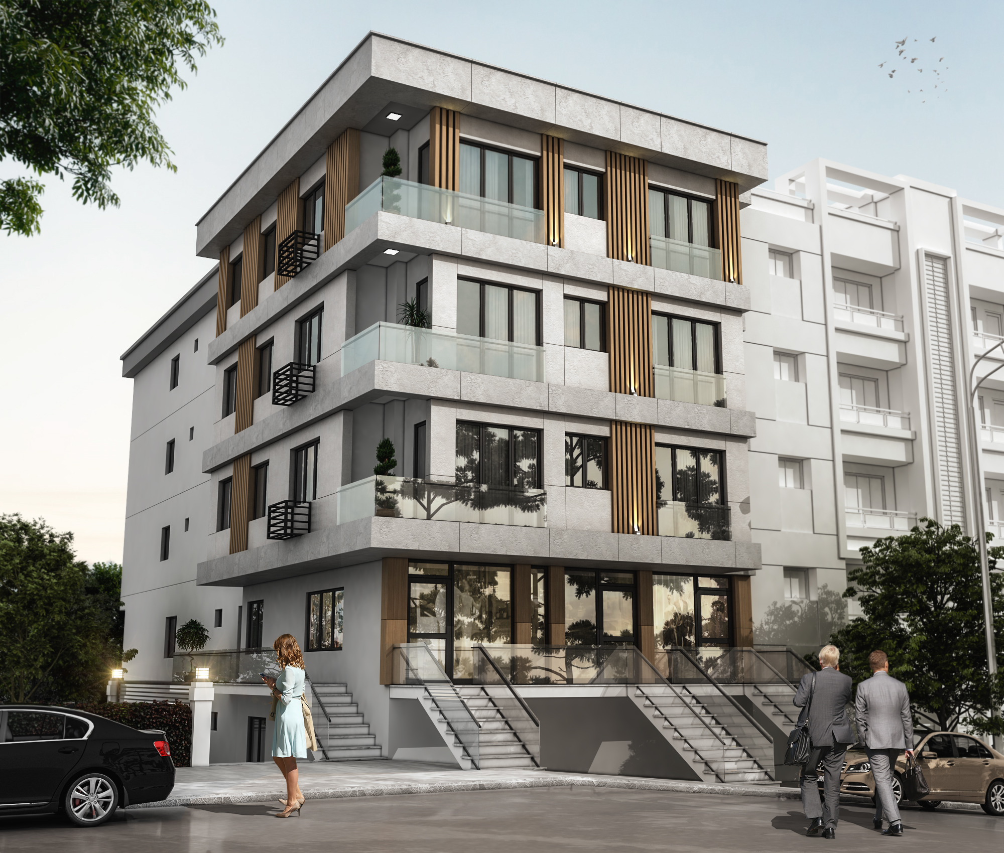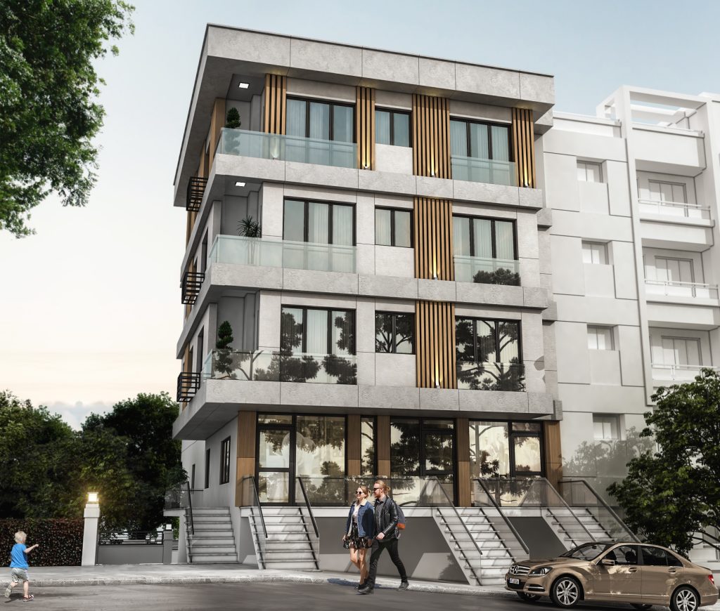 Cephe tasarımında, bölgenin mimari kimliği ve çevresel bağlamıyla uyumlu malzeme ve renk seçimleri ön plana çıkarılmış; sade, zarif ve zamansız bir dış görünüm elde edilmiştir. Yalın geometrik formlar ve ritmik cephe düzenlemeleri, yapının karakterini vurgularken çevresiyle dengeli bir bütünlük sağlamaktadır. İç mekânlarda doğal ışığın etkin kullanımı, ferah hacim planlamaları ve ergonomik tasarım ilkeleri doğrultusunda, kullanıcı deneyimini zenginleştiren yaşam alanları tasarlanmıştır.