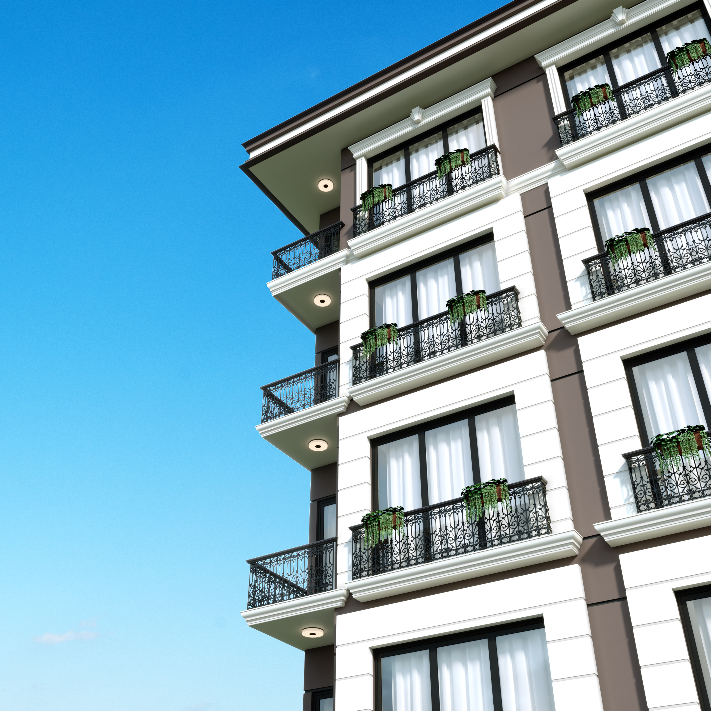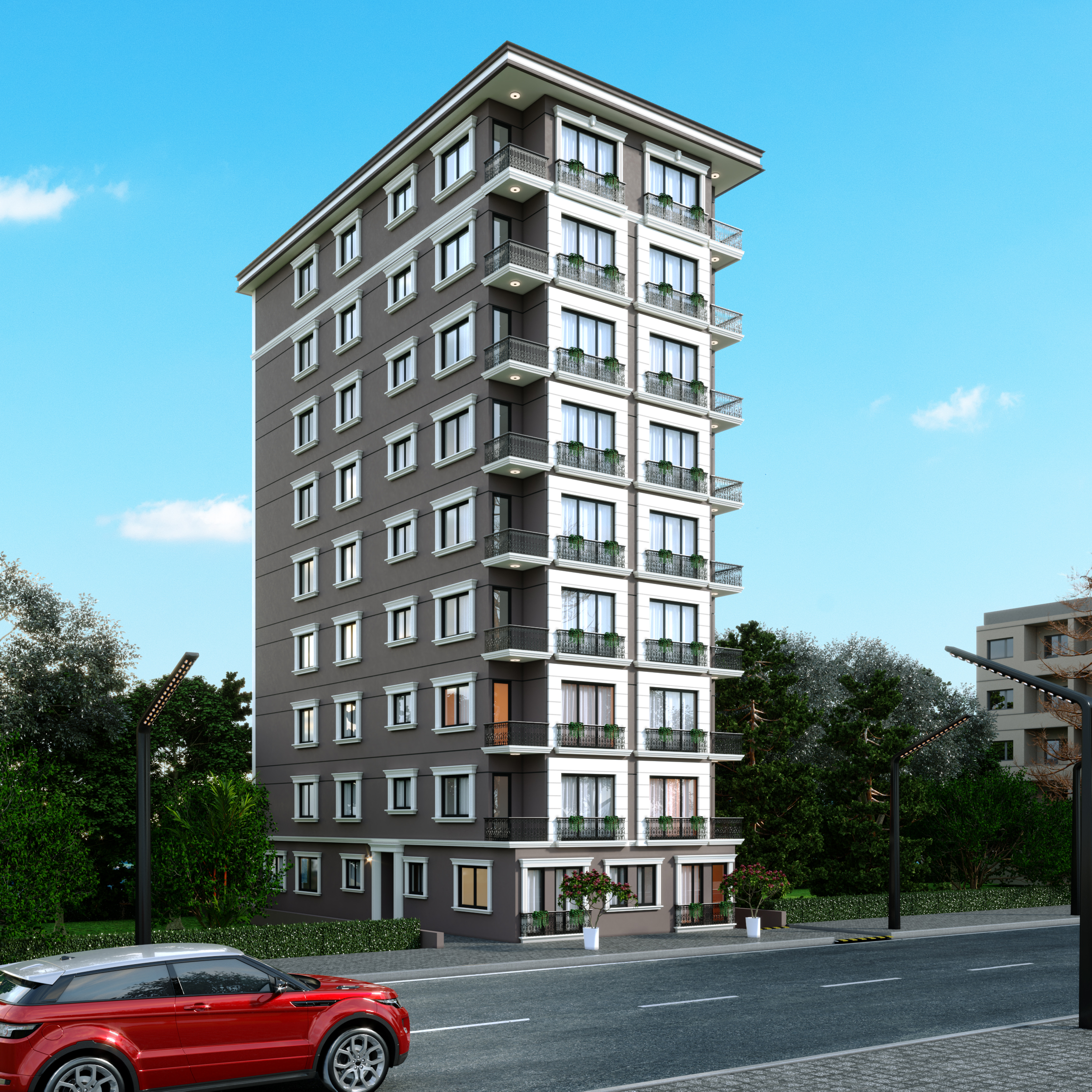 Cephe tasarımında, bölgenin mimari kimliğiyle uyumlu malzeme ve renk tercihleri kullanılarak yapı, sade, zarif ve zamansız bir dış görünüm kazanmıştır. Yalın geometriler ve ritmik cephe kurgusu, hem yapının karakterini öne çıkarmakta hem de çevresiyle dengeli bir bütünlük sağlamaktadır. İç mekânlarda doğal ışığın etkin kullanımı, ferah hacim planlamaları ve ergonomik tasarım ilkeleri ön planda tutularak, kullanıcı deneyimini zenginleştiren yaşam alanları oluşturulmuştur.