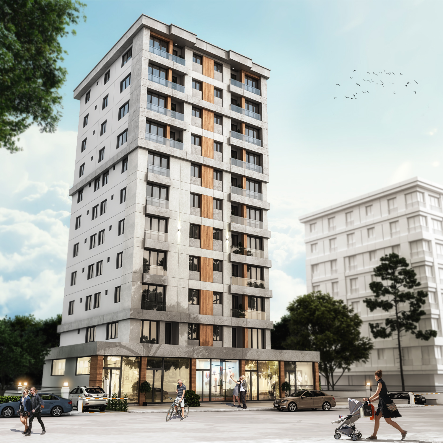 Cephe tasarımında, bölgenin mimari kimliği ve çevresel karakteri ile uyumlu malzeme ve renk seçimleri tercih edilmiş; sade, zarif ve zamansız bir dış görünüm elde edilmiştir. Yalın geometrik formlar ve ritmik cephe düzenlemeleri, yapının karakterini öne çıkarırken çevresiyle dengeli bir bütünlük sağlamaktadır. İç mekânlarda doğal ışığın etkin kullanımı, ferah hacim planlamaları ve ergonomik tasarım ilkeleri doğrultusunda, kullanıcı deneyimini zenginleştiren yaşam ve çalışma alanları tasarlanmıştır.